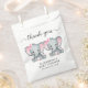 Joli merci fête sacs de faveur pour votre bébé jumeaux douche avec "merci" dans un script gris mou avec des swashes et une aquarelle rose de deux bébés éléphants. Personnalisez le nom et la date de la douche de la future mère dans une simple typographie grise.