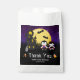 Ce sac de faveur amusant et éffrayant présente de mignons vampires à côté d'une maison hantée tordue. Dans l'arrière - plan est une pleine lune avec des chauves-souris et un ciel de nuit violet avec des étoiles. Le texte combine les polices décoratives et serif pour un look élégant et moderne. C'est parfait pour une fête d'anniversaire à thème Halloween.