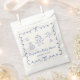 Sacs de faveur crème légère pour votre bébé garçon douche avec cadre bleu français ondulé orné d'arcs, illustrations fantaisistes dessinées à la main de coeurs, étoiles, décor de gâteau et de pépinière, et le nom de la mère à être présenté dans un script bleu amusant et ludique.