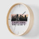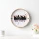 Modern wall clock features skyline silhouette of Sacramento, CA with map coordinates on a watercolor splash background.