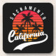 Sacramento coaster with a retro design that features a sunset and palm trees on black background (customizable bg colour). This design also features California in a handwritten font with a swash tail glyph for that stylish retro look. This coaster is just for you if you are from Sacramento or you can get as a gift or souvenir for someone.