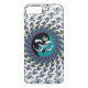 Sacred Geometry Fractal Spiral with Yin-Yang and OM in shades of teal green, dark blue, purple, silver and white, with a teal and black yin-yang symbol of balance, harmony, unity and completion. A metallic purple or lavender OM (Aum) symbol is centred on it to adorn and protect your favourite phone, tablet or mobile device.