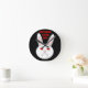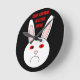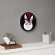 This awesome clock features the sad face of a white rabbit. This rabbit has a big frown on its face because it is a lab rabbit that has had cosmetics tested on it. The whites of its eyes are red and swollen. The design has been created to bring to attention the unnecessary suffering caused by the testing of cosmetics on animals. The bold red text reads “stop animal testing now!”