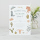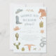 Cute boy's western theme birthday party invitation card featuring illustrations of cowboy boots, horse, snake, skull, cactus, cowboy hats, etc. The text says "saddle up!"