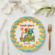 Kids turning two years old who love animals, especially safari or zoo animals will love these colourful safari theme birthday paper plates that feature jungle plants and trees, a giraffe, lion, birthday balloons, sun, text that reads Look Who's 2, a border of blue, green, orange, brown, and white chevron stripes, and a yellow decorative ring! You can easily add your child's name to personalize these safari 2nd birthday paper plates!