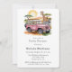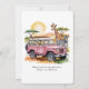 A watercolor clipart illustration featuring a vintage, bubblegum-pink Jeep with whitewall tires. The Jeep is angled slightly to the right, showcasing its round headlights and chrome bumpers, with a small, hand-drawn "Safari Adventures" label affixed to the hood. Three friendly safari animals—a giraffe, a lion, and a zebra—are playfully posed around the Jeep, with the giraffe gently nuzzling the front fender. The background is a soft wash of pale yellow and light green, suggesting a sun-drenched savanna with distant acacia trees.