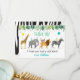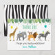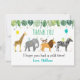 Cet adorable carte de remerciements d'anniversaire comprend des animaux de safari portant des casquettes festifs avec un arrière - plan de feuilles tropicaux, de vignes et de confettis colorés.