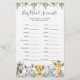 Safari animals themed baby shower word scramble game card features a watercolor safari animals illustration and watercolor greenery eucalyptus garland and elegant handwritten style font.