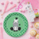 This party plate features a green background with a repeating pattern of jungle leaves. A cute baby clipart black and white zebra sits in the centre of the plate.