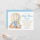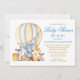 Modern Elegant Watercolor Baby Animals Hot Air Balloon Baby Shower by Mail Invitation. Baby Animals include Elephant with Blue Bow, Monkey, Giraffe, Rhino, Zebra and Lion. Gold and Blue Script.