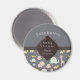 A baby shower thank you magnet with the guest of honour's name. With a pattern composed of a collection of cute wild animals in a nursery art style - including alligators, monkey, birds, turtles, giraffes, elephants and lions all drawn in pastel colours. Set on a brown background. The centre has a brown diamond shaped frame made with watercolors, with the the event name and "thanks for coming" written inside.