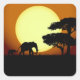 This illustration shows a mother elephant together with her baby elephant, walking through the african savannah during sunset.