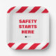 Red and white fire safety paper plates with "Safety Starts Here" and your logo. Fully customizable. You can change the text, put your company logo or delete it. Safety first!