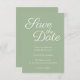 The Save the Date typography text is a lovely contemporary elegant calligraphy style in white against solid sage.