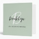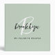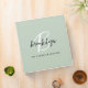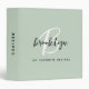 This trendy personalized recipe binder features a monogram and first name in modern black and white script on a sage green background, with the additional text in black sans serif font on the front cover and spine.