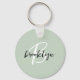 This elegant personalized keychain features a monogram and first name in modern black and white script on a sage green background.