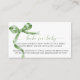 Add a thoughtful touch to your baby shower with our Sage Green Bow Book for Baby Enclosure Card. Featuring a delicate green bow design, this card invites guests to bring a cherished book in place of a traditional card to help build baby’s first library. The elegant design perfectly complements your baby shower theme, while the high-quality cardstock ensures a polished look. Ideal for adding a personal and meaningful request to your baby shower invitations.