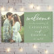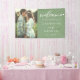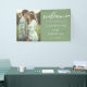 This simple solid sage green wedding banner features elegant white script and your couple engagement photo for an outdoor ceremony in a nature setting. Minimalist typography on peaceful light green decor for a rustic venue outside near a forest of trees.