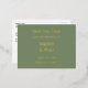 Sage Green Enregistrer la date Foil Invitation Postcard, s'il vous plaît personnaliser l'avant et l'arrière de la carte postale en utilisant le modèle de personnalisation en ligne avant de commander. L'avant de la carte postale présente un véritable texte métallique sur un arrière - plan vert sage, tandis que l'arrière de la carte postale est recouvert d'encre noire sur un arrière - plan blanc. Si vous souhaitez modifier la mise en page ou customiser la conception d'un type d'événement autre qu'un mariage, faites défiler le modèle de personnalisation et cliquez sur l'option "Modifier en utilisant l'outil de conception" pour "Customiser plus loin".