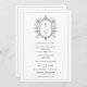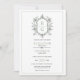 Elegant sage green vintage floral crest monogram and border wedding invitation. Invite your guests with this charming wedding invitation featuring a sage green vintage floral design. A beautifully crafted crest showcases your personalized monogram along with your names in complementary green typography. A thin green border completes the elegant look. On the back, a QR code provides quick access to RSVP details and other essential wedding information.