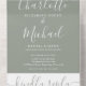 All in one wedding invitation with pretty greenery floral, signature style names and chic typography on a sage green background. The invitation includes a perforated RSVP card that can be individually addressed or left blank for you to handwrite your guest's address details. Designed by Thisisnotme©