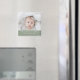 This fridge magnet features a fun script styled font "Hello, Baby" at the bottom edge of the your own baby photo above a sage green background with your baby's name and birth date in a modern clean crisp printed white font.. ,