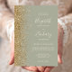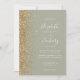 The left-hand edge of this elegant modern wedding invitation features a gold faux glitter border. The customizable text combines ivory handwriting, copperplate and italic fonts on a sage green background. The reverse side features a matching sage green and gold design.