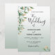 On front: Botanical theme. Sage green gradient, ombre background. Decorated with greenery, sprigs and foliage with small golden flowers. Modern large hand lettered script, typography with the text: The wedding of. Templates for Your names and wedding details. Black text.