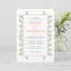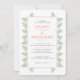 This wedding invitation features sage green leaves peeking out of the edges of a light coral border all on a white background. The backside is accented with a small sage green leaf pattern. This invitation design is perfect for an outdoor wedding full of natural beauty.