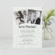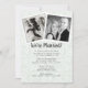 Pale sage green, leaves and flowers, marriage announcement with two photo templates at the top. "We're married!" text in bold script beneath square pictures of the couple. Your photos can be or any orientation and size with the subject in the centre. They will pop into place inside white frames. A leafy pattern is the background for dark grey text. Include reception information, or any wording, which is easy to personalize for your event in paragraph form.