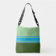 Add a touch of elegance and whimsy to your accessories with this unique crossbody bag. On the front, a charming dark green and sage green big stripe background meets one azure blue turqouise stripe with yellow small ones for your family name or monogram. Flip it over to find the same luxurious dark green and sage green stripes with multiple small yellow stripes. It's two styles in one—a delightful blend of sophistication and artistry, all in a single crossbody bag.
