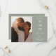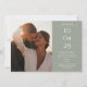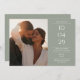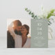 A modern minimalist save-the-date card featuring your special date, photo and wedding details set in classic, chic typography on a sage green background. Designed by Thisisnotme©