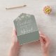 All in one wedding invitation featuring pretty string lights, mason jars, signature style names and chic typography on a sage green background. The invitation includes a perforated RSVP card featuring a QR code. Designed by Thisisnotme©