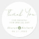 This round sticker for your wedding is designed with an elegant monochrome theme, featuring sage green script calligraphy that spells out the phrase "Thank You." The sticker also includes space for you to personalize it with your names, adding a special touch to your wedding favours or thank you cards.