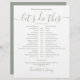 This simple elegant sage green let's do this' wedding schedule timeline can be personalized with your wedding details in modern white lettering. Designed by Thisisnotme©