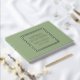 Solid sage green colour, simple wedding guest book with stylized foil print within a square border that features the bride and groom's name along with wedding date in your choice of colour foil print. Seen here in silver foil print. Select your guest book style.