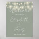 This sage green string lights elegant script wedding welcome sign can be personalized with your information in chic typography. Designed by Thisisnotme©