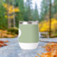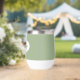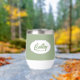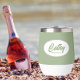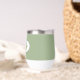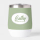 Gift your wedding bridesmaid with this trendy and personalized, stainless steel wine tumbler with her name in stylized script inside a white, oval design. Background colour and script is a sage green colour. Perfect for a bachelorette party as well! Personalize your wine tumbler by editing and replacing bridesmaid name with desired name. Available in many, popular bridesmaid wedding colour schemes.