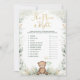 This elegant baby shower game features a cute teddy bear holding a heart-shaped balloon framed with a beautiful watercolor greenery wreath
