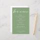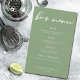 This simple solid sage green wedding bar menu features elegant white script for an outdoor ceremony in a nature setting. Minimalist typography on peaceful light green sheet for a rustic venue outside near a forest of trees.