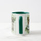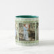 Elegant photo mug featuring your own photos framed by a sage green patterned design with leaves. Beautiful as a Save the Date or engagement mug or as a wedding gift for newly weds, and customizable for any other occasion.