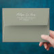 Chic, modern and simple wedding return address envelope with your names in white elegant handwritten script calligraphy on a sage green background. Simply add your names and address. Exclusively designed for you by Happy Dolphin Studio. If you need any help or matching products please contact us at through our store chat. We're happy to help you make your wedding the most beautiful day!