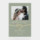 Embrace timeless elegance with our minimalist sage green wedding welcome sign, featuring a striking photo of the happy couple. Enhanced by a romantic gold rope heart and delicate handwritten calligraphy, it's the perfect blend of modern sophistication and heartfelt charm.