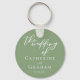 This simple solid sage green wedding keychain favour features elegant white typography for an outdoor ceremony in a nature setting. Minimalist script on a peaceful light green keepsake gift for a rustic venue outside near a forest of trees.