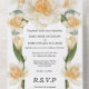 A beautiful all-in-one spring or summer invitation featuring pretty pale yellow daffodil flowers resting between sage green leaves that form a border around templates for your personalized wording all set against a white background on the inside and a soft green one on the outside. The bottom third has a tear off response card with personalized rsvp address for your guests to complete. These are ideal for tropical, jungle, coastal destination, Hawaiian and floral theme wedding, engagement, anniversary and birthday parties.