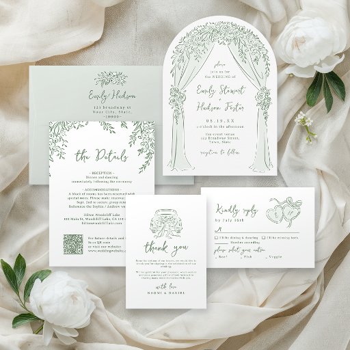 Sage Hand Drawn Floral Arch Whimsical Wedding All In One Invitation