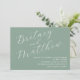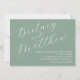 Sage minimalist photo wedding invitation with simple elegant calligraphy script for bride and groom's names.