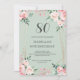 Customizable 80th birthday invitation, featuring pretty pink blush floral bouquets and leafy greenery on a sage green background, with a gold geometric frame.