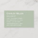 The background is sage (grene), the text is white. On the front, the name is written in an elegant calligraphic script. The rest of the text is in caps.