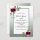 Sur l'avant : dégradé vert de Sage avec un cadre vert et blanc sage. Décoré de fleurs, de roses en Bourgogne avec verdure. Modèles pour que la mariée soit le nom et les détails du parti. Le nom et la Fête des mariées sont écrits avec un script de style écrit à la main, des lettres de couleur noire. Arrière : arrière - plan de dégradé vert sage. Conseil : Si vous ne voulez pas qu'il ressemble à une carte postale, cliquez sur customiser, allez à l'arrière et retirez le séparateur et le timbre postal.